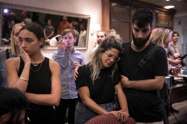 And for parts of the New York Left. An Israel-born rabbi of a progressive New York synagogue, after comforting his congregants all day on the phone, reported that ‘those most devastated were either people who had lost close friends or family, or young Jews “completely shattered by the response of their lefty friends in New York,” who were either justifying Hamas’s atrocities or celebrating them outright’ wrote Michelle Goldberg in the New York Times.